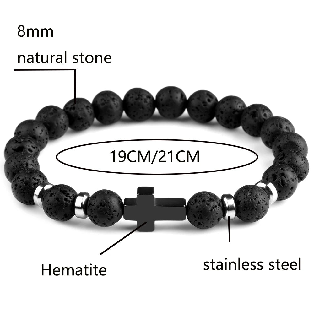 Name: Natural Stone Bracelets Hematite Cross Pendent 8mm Tiger Eye Black Onyx Lava Howlite Bead Elastic Rope Bracelet For Men Gift